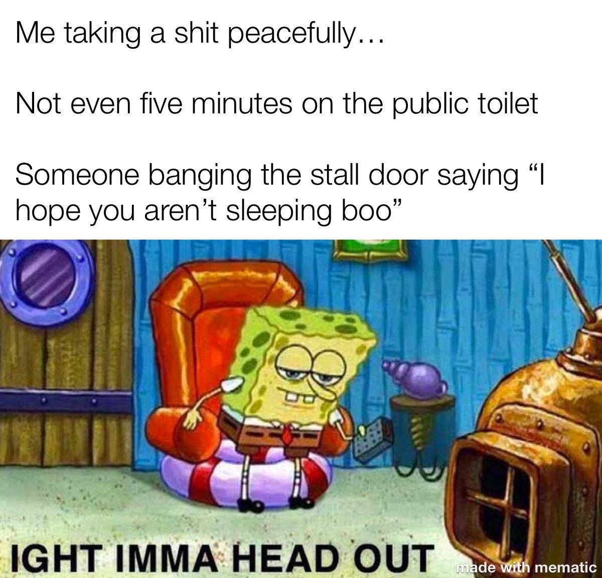 #funny #relatable #awkward #SpongeBob #public toilet #bathroom humor #image macro #Ight Imma Head Out #cartoon #work humor #social anxiety #viral memes