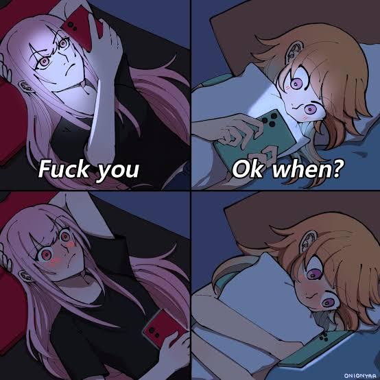 This FunnyMemes, ReactionMemes, AnimeMemes, RelatableMemes, TextingMemes meme features Four-panel anime style image of two girls texting in bed at night. Top-left: pink-haired girl lying on a pillow, phone glowing red, overlay text “Fuck you.” Top-right: orange-haired girl on a pillow, phone glowing green, overlay text “Ok when?” Bottom-left: same pink-haired girl now blushing and surprised, holding the red phone. Bottom-right: orange-haired girl hugging a pillow and blushing while looking at her phone. Night-time lighting and dramatic phone glow throughout.. Created and shared on Jart.lol, this image meme represents the best of internet culture and humor.