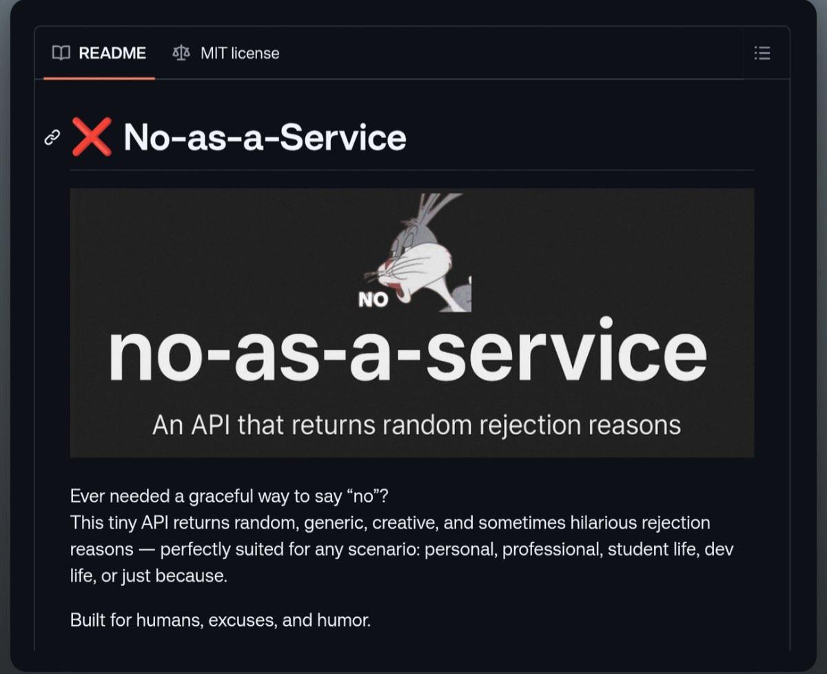 This humorous meme features Bugs Bunny saying no, showcasing the No-As-A-Service API which provides creative and funny rejection reasons for any situation.