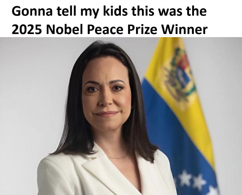 This FunnyMemes, HistoryMemes, ClassicMemes meme features Woman in white blazer smiling in front of Venezuelan flag with text saying 'Gonna tell my kids this was the 2025 Nobel Peace Prize Winner'. Created and shared on Jart.lol, this image meme represents the best of internet culture and humor.
