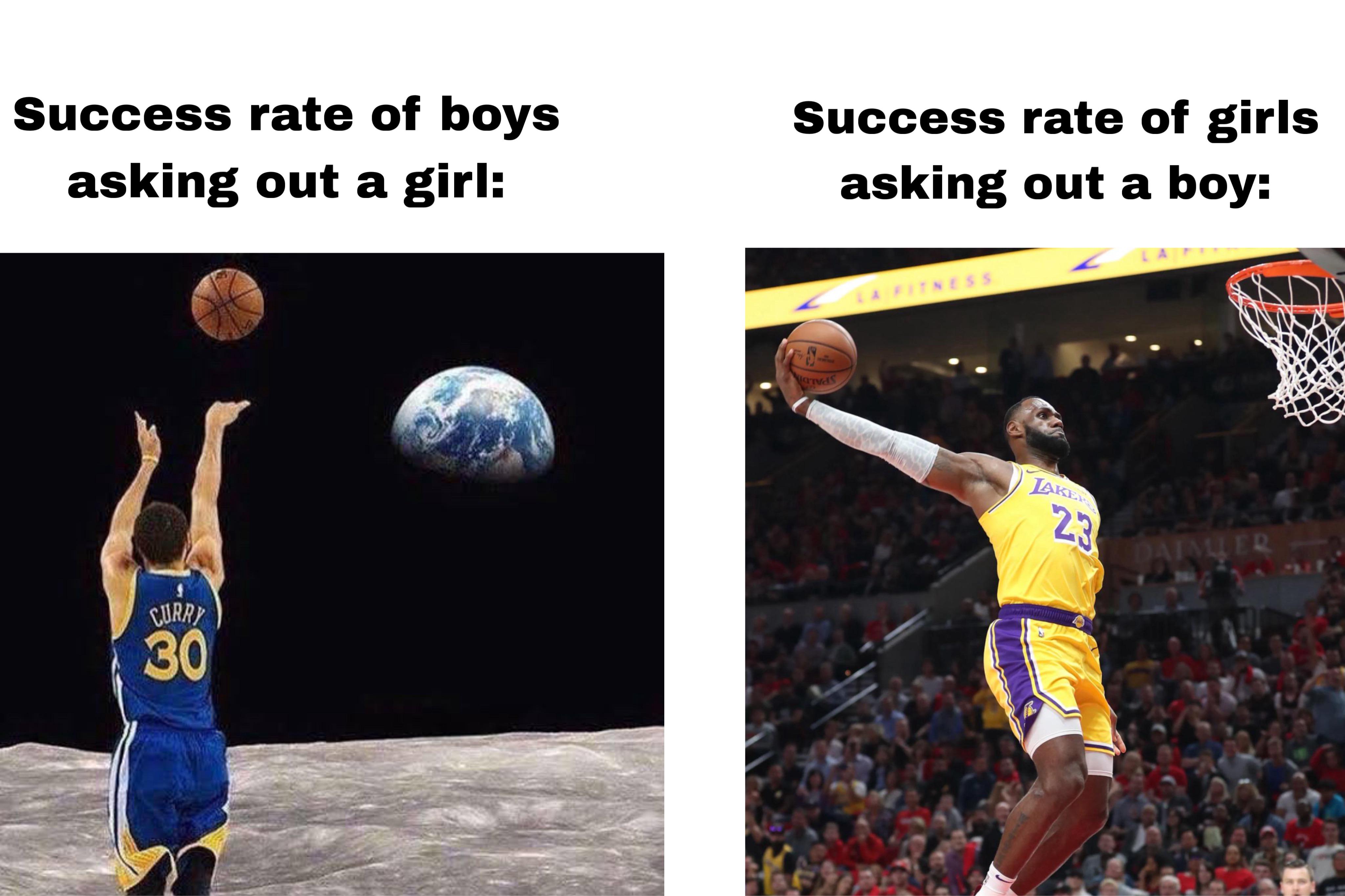 This comparison meme contrasts the difficulty of boys asking girls out versus girls asking boys out using basketball imagery of Steph Curry and LeBron James.