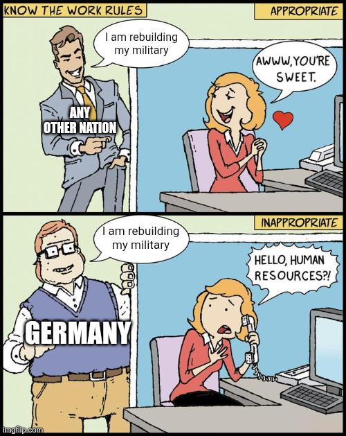 A satirical meme template comparing how different nations are perceived when rebuilding their military, highlighting the historical stigma surrounding Germany.
