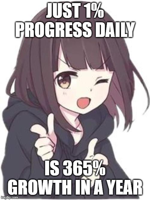 An anime girl points with both hands in this positive meme about growth. It highlights how consistent one percent daily progress leads to major success.