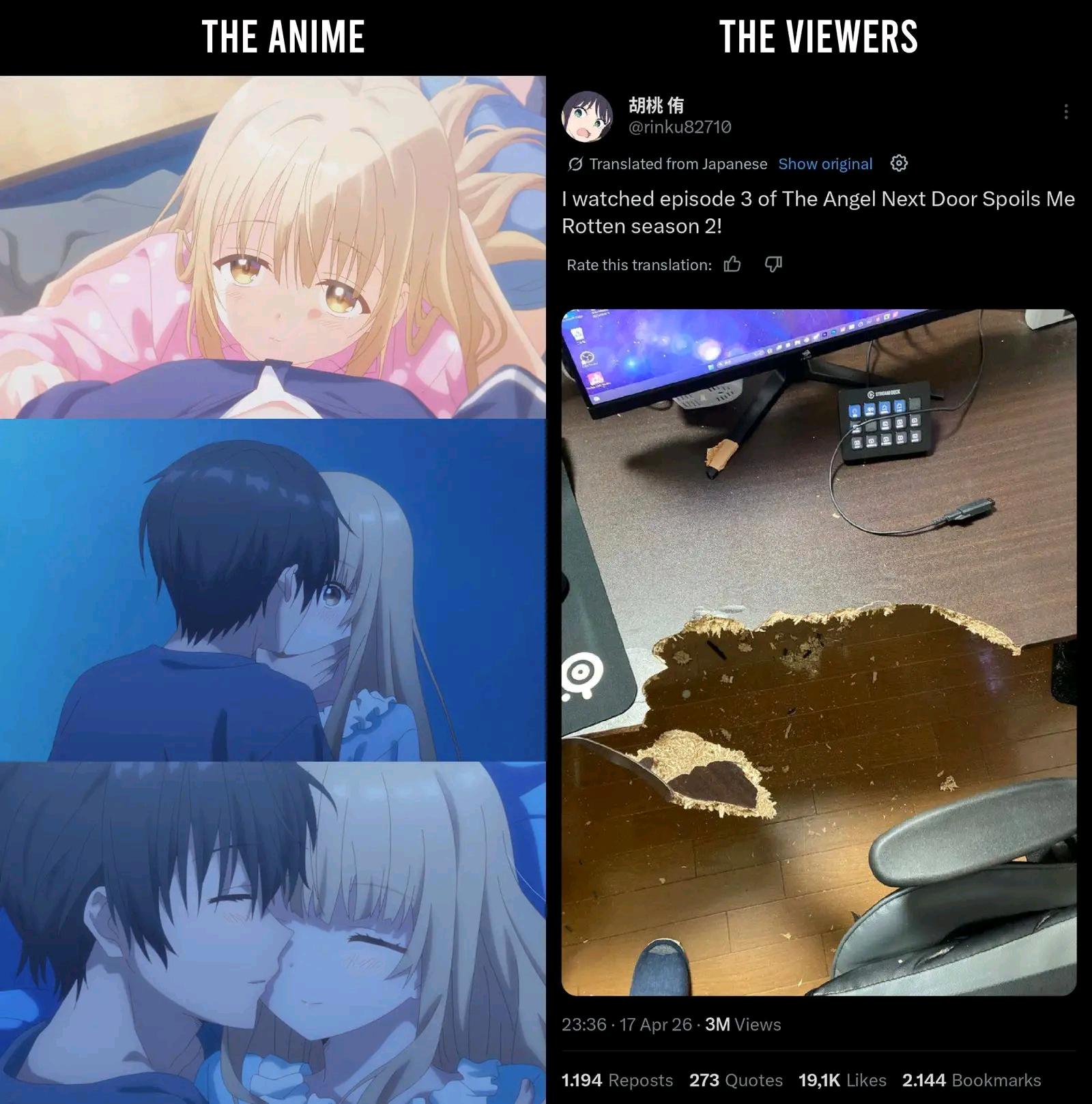 This comparison meme highlights the contrast between the romantic scenes in The Angel Next Door Spoils Me Rotten and the lonely reality of the viewers.