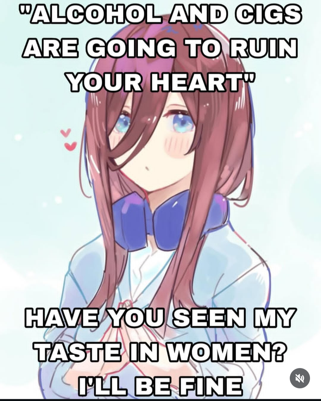 An anime meme featuring Miku Nakano with text joking that bad choices in women are far more dangerous to one's heart than alcohol or cigarettes could be.