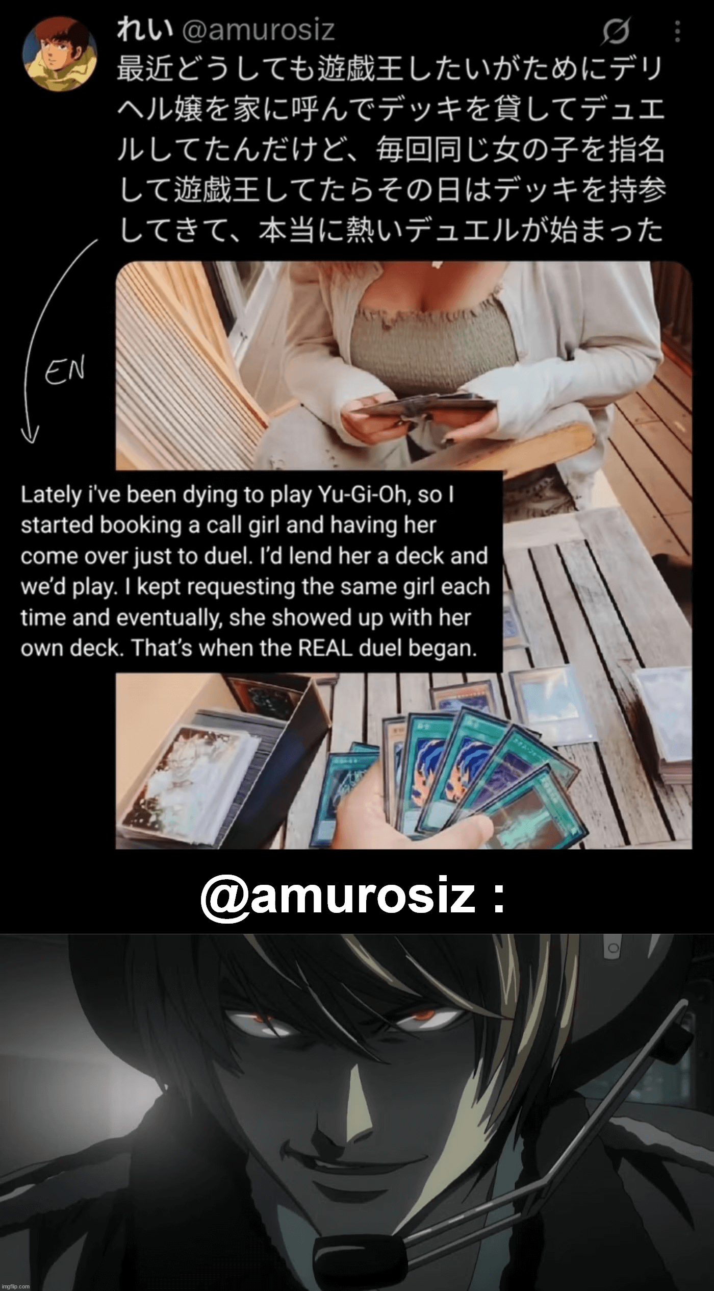 This FunnyMemes, GamingMemes, ReactionMemes meme features Screenshot collage: top shows a Japanese tweet with English translation describing booking a call girl to play Yu Gi Oh; middle photo of a woman holding trading cards at a wooden table and a hand holding several Yu Gi Oh cards; large @amurosiz text between panels; bottom panel shows a dark anime character smirking with a headset.. Created and shared on Jart.lol, this image meme represents the best of internet culture and humor.