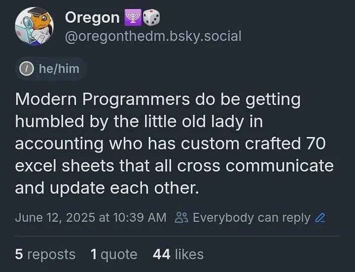 Programmers think they're smart until they meet the Excel wizard in accounting.
