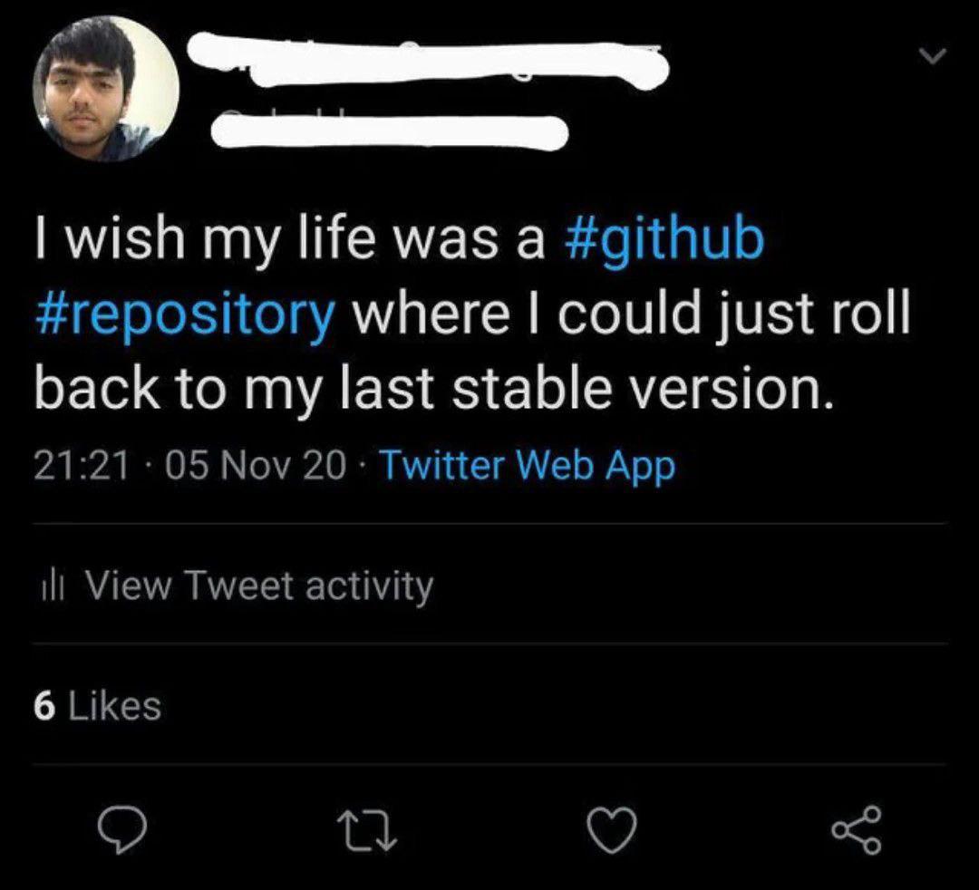 This FunnyMemes, TechMemes, RelatableMemes, ProgrammingMemes meme features Screenshot of a tweet: I wish my life was a #github #repository where I could just roll back to my last stable version.. Created and shared on Jart.lol, this image meme represents the best of internet culture and humor.