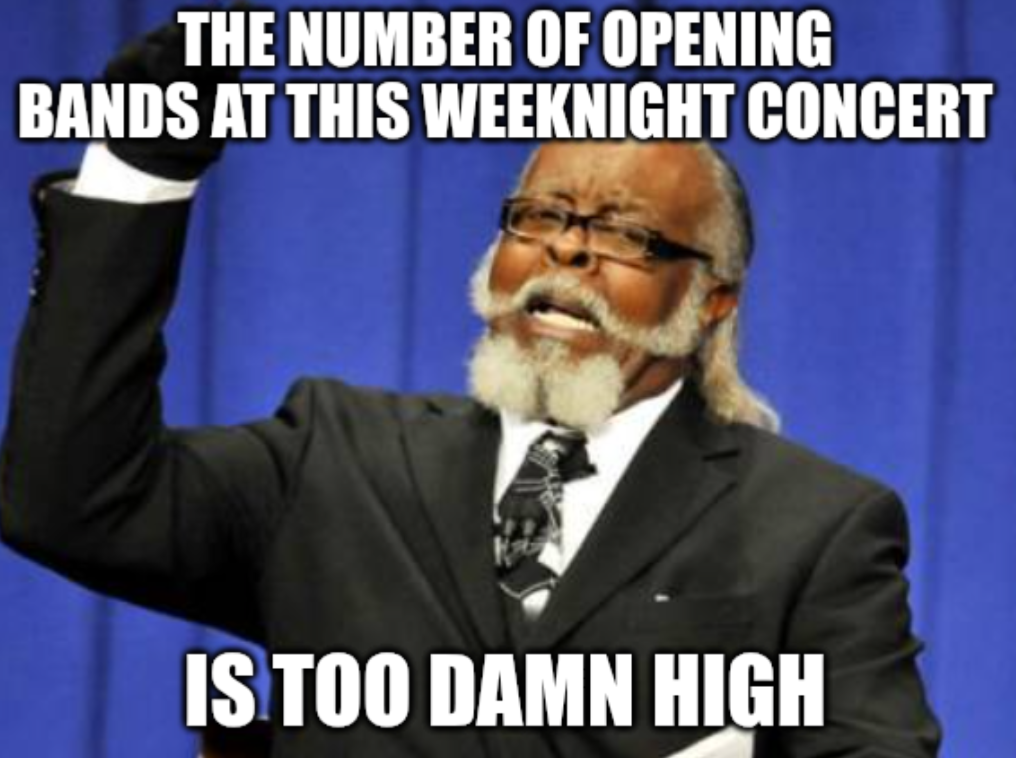 This classic meme features Jimmy McMillan expressing frustration about the excessive number of opening bands at a weeknight concert, a relatable music gripe.