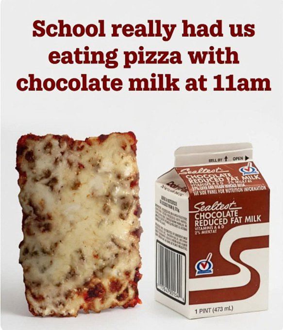 A nostalgic look back at the classic school lunch combination of rectangular pizza and a carton of chocolate milk, a staple meme for childhood memories.
