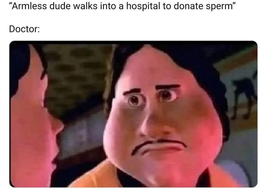 This dark humor meme features a character with a confused expression responding to a hypothetical scenario about an armless man trying to donate sperm.