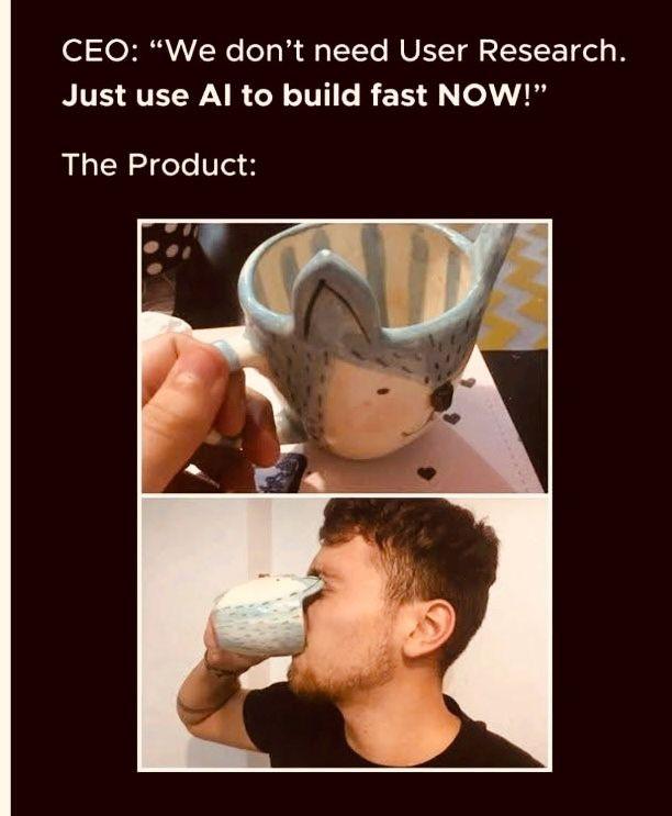 This meme mocks companies that prioritize fast AI development over user research, resulting in a poorly designed product that pokes the user in the eye.