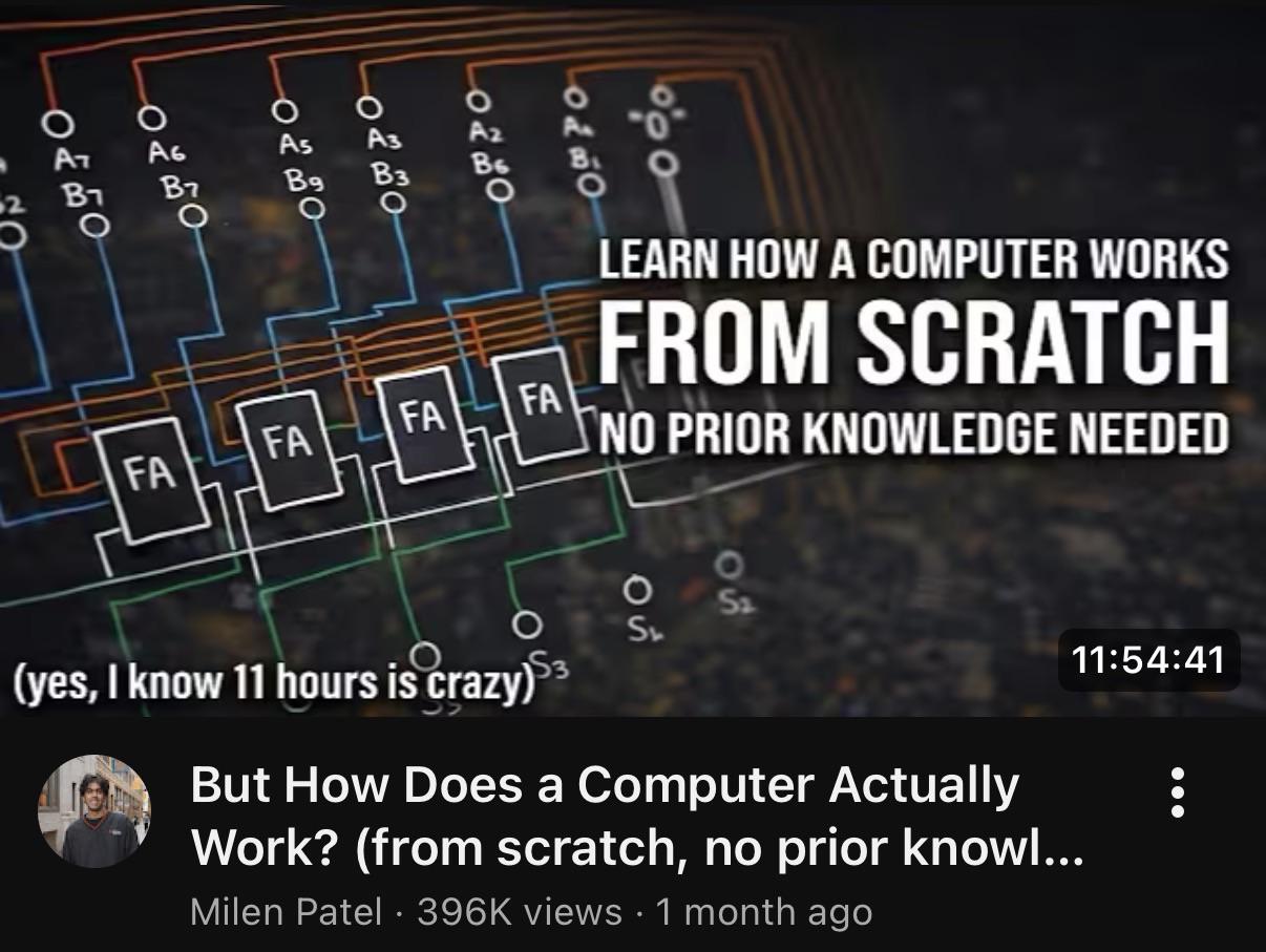 A relatable meme about a massive eleven hour educational video on how computers work, highlighting the struggle of being an ambitious learner on the internet.