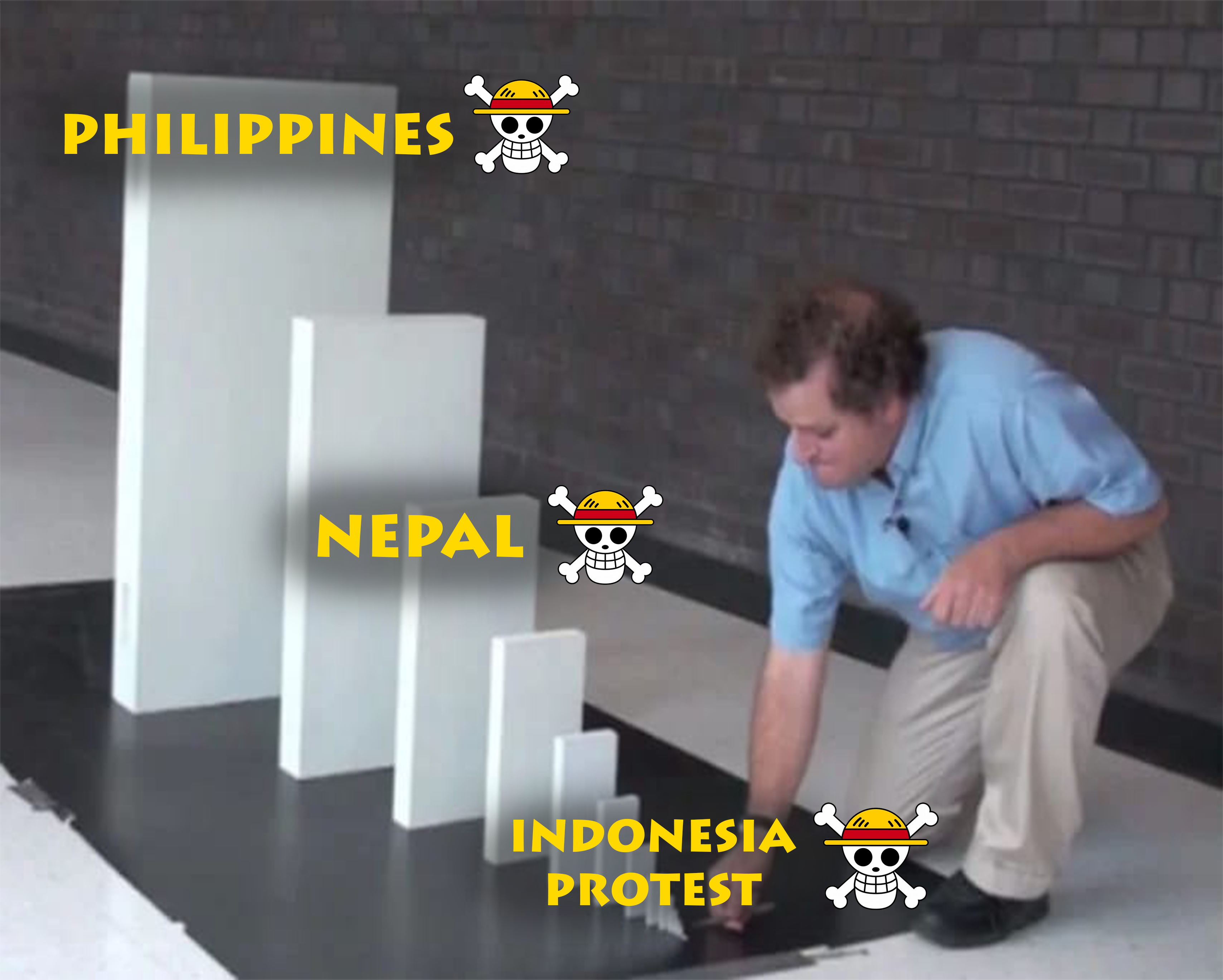 Epic domino effect meme shows how an Indonesia protest could trigger events in Nepal and the Philippines. Viral meme template for trending memes.