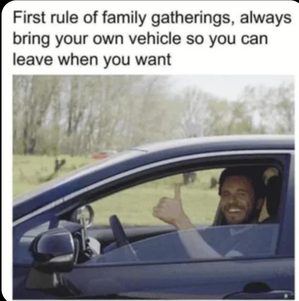 Must Bring Car. This viral family meme advises you to always bring your own vehicle so you can leave when you want. Relatable memes for awkward gatherings.