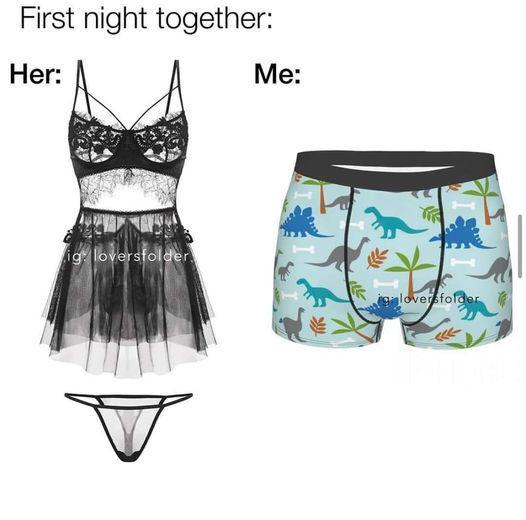 Tagged with funny, relatable, awkward, lingerie, dinosaur boxers, underwear, couples humor, relationship memes, image macro, reaction image, viral meme, first night, this meme is easily discoverable through Jart's advanced search system. These tags help users find similar memes and explore related content across our platform.