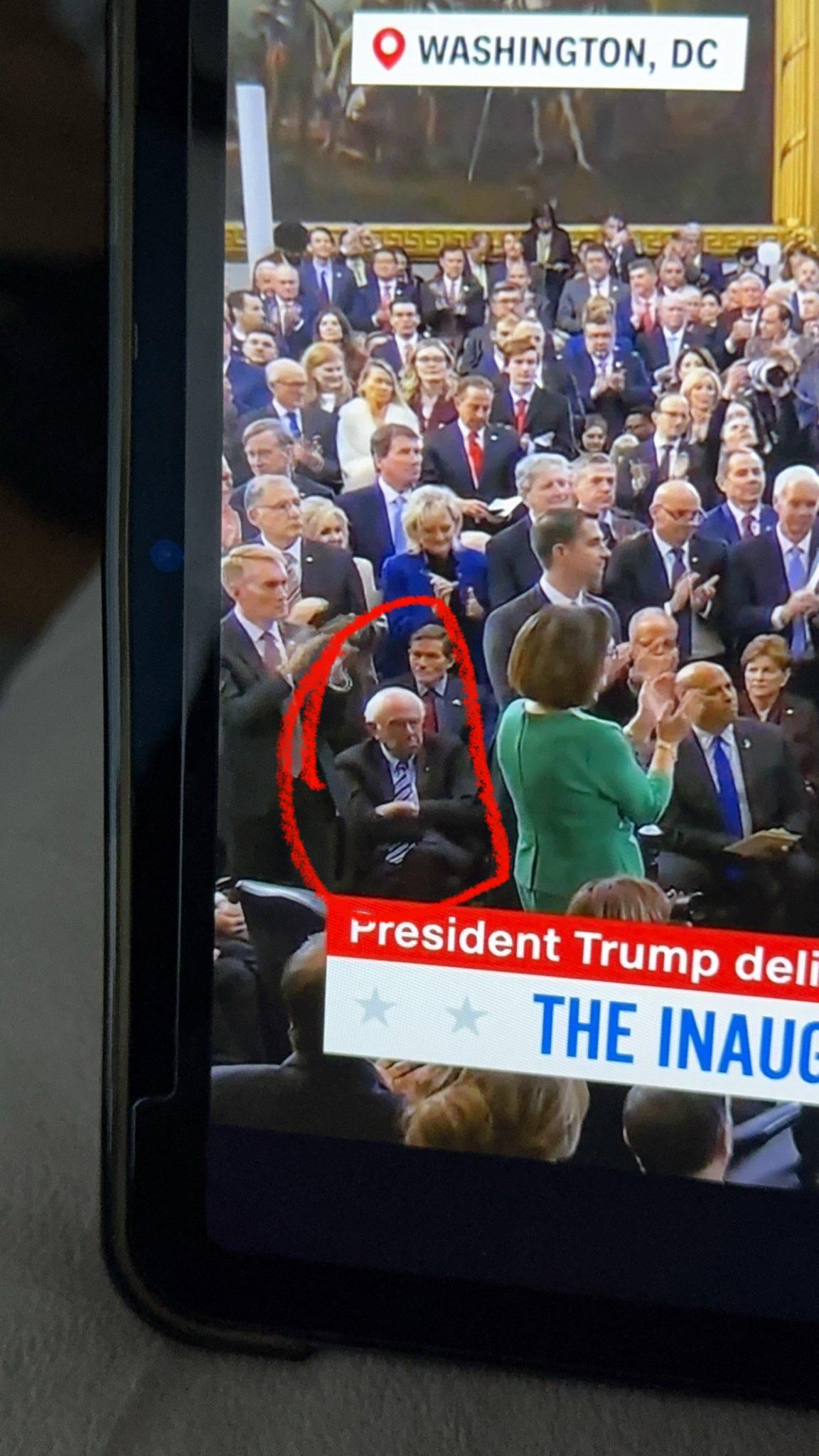 Look at this viral reaction meme: a circled cross-armed man sitting during an inauguration, refusing to applaud. Relatable, funny memes going viral.