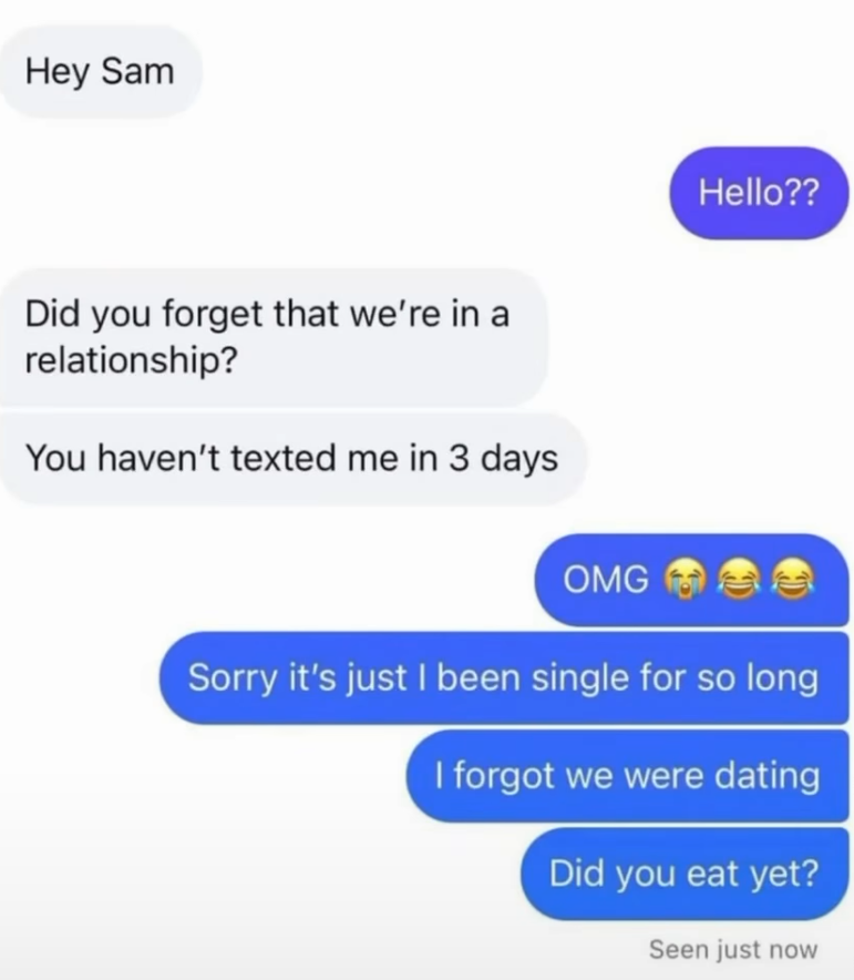 This FunnyMemes, ReactionMemes, RelationshipMemes meme features Screenshot of a text conversation. Left gray bubble: "Hey Sam". Right purple bubble: "Hello??" Left gray bubbles: "Did you forget that we're in a relationship?" and "You haven't texted me in 3 days". Right blue bubbles: "OMG ðŸ˜ðŸ˜‚😂", "Sorry it's just I been single for so long", "I forgot we were dating", "Did you eat yet?" Bottom right small gray text: "Seen just now".. Created and shared on Jart.lol, this image meme represents the best of internet culture and humor.