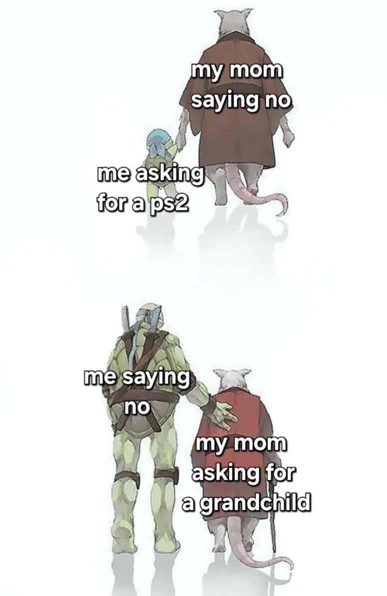 Relatable family drama: this viral meme flips expectations as kids get denied a PS2 but adults deny moms a grandchild. Classic memes perfect for sharing.
