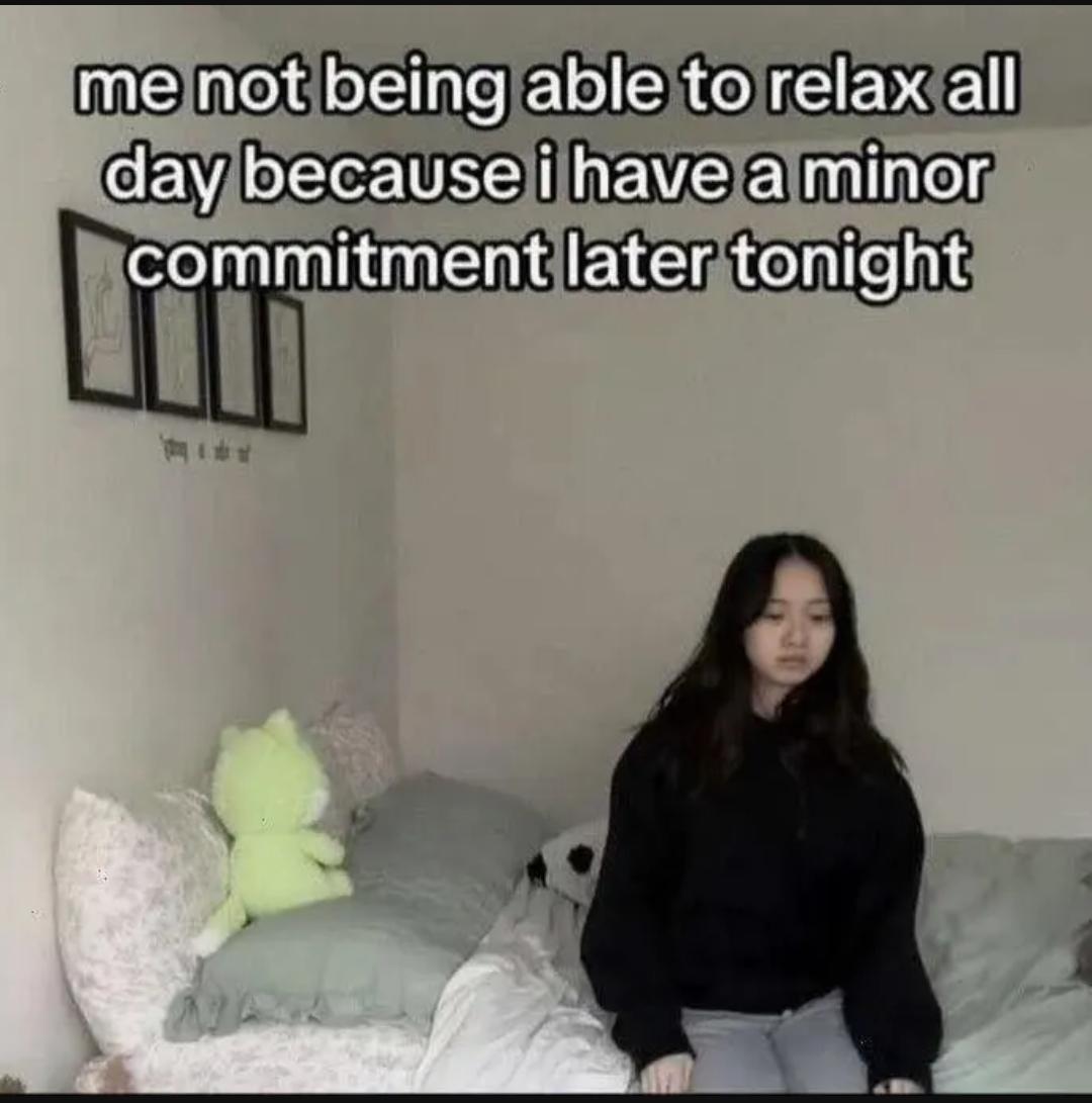 This FunnyMemes, ReactionMemes meme features Top text: 'me not being able to relax all day because i have a minor commitment later tonight'. Photo of a young woman sitting on the edge of a bed looking blank and anxious, with pillows and a stuffed toy on the bed in a plain bedroom.. Created and shared on Jart.lol, this image meme represents the best of internet culture and humor.