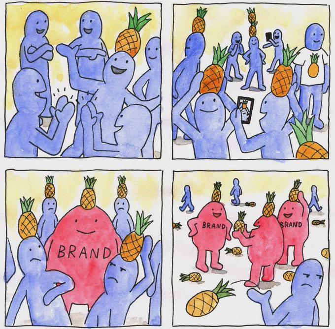This FunnyMemes, ReactionMemes, MarketingMemes meme features Four-panel watercolor comic showing blue humanoid figures wearing pineapples on their heads at a social gathering. Panels 1-2 show them mingling and taking photos. Panel 3 introduces a large pink blob character labeled 'BRAND' also wearing a pineapple; blue figures look surprised. Panel 4 shows multiple pink 'BRAND' blobs multiplying and scattering pineapples while some blue characters appear annoyed. The only visible text in the image is the word 'BRAND' on the pink figures.. Created and shared on Jart.lol, this image meme represents the best of internet culture and humor.