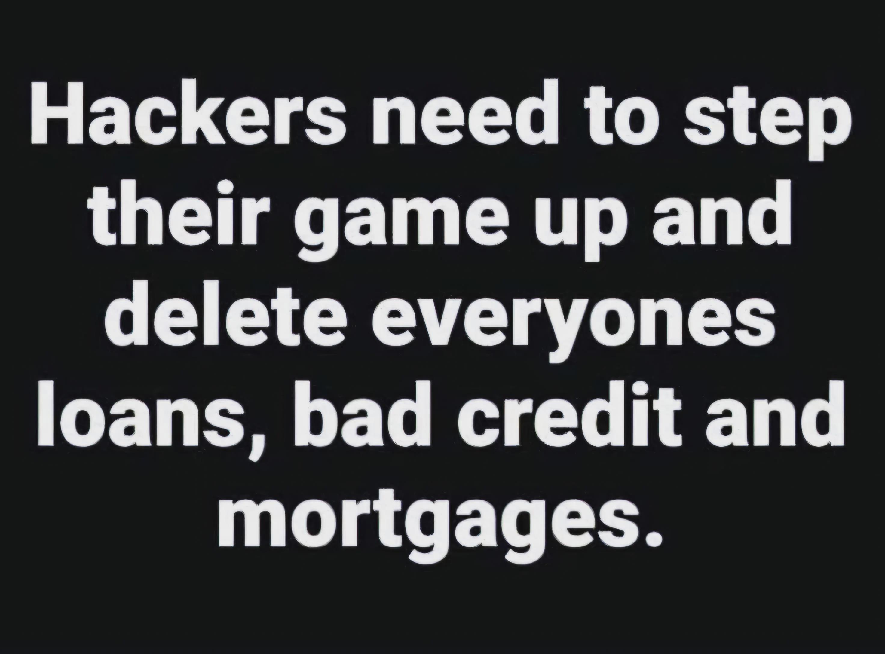 This FunnyMemes, ReactionMemes, FinanceMemes meme features White bold sans-serif text centered on a black background reading: "Hackers need to step their game up and delete everyones loans, bad credit and mortgages.". Created and shared on Jart.lol, this image meme represents the best of internet culture and humor.