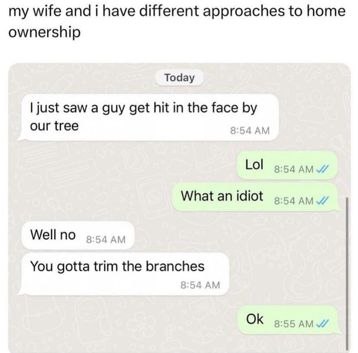 Watch this hilarious WhatsApp text meme about home ownership: husband laughs as wife points out tree trimming duty. Viral memes for couples.