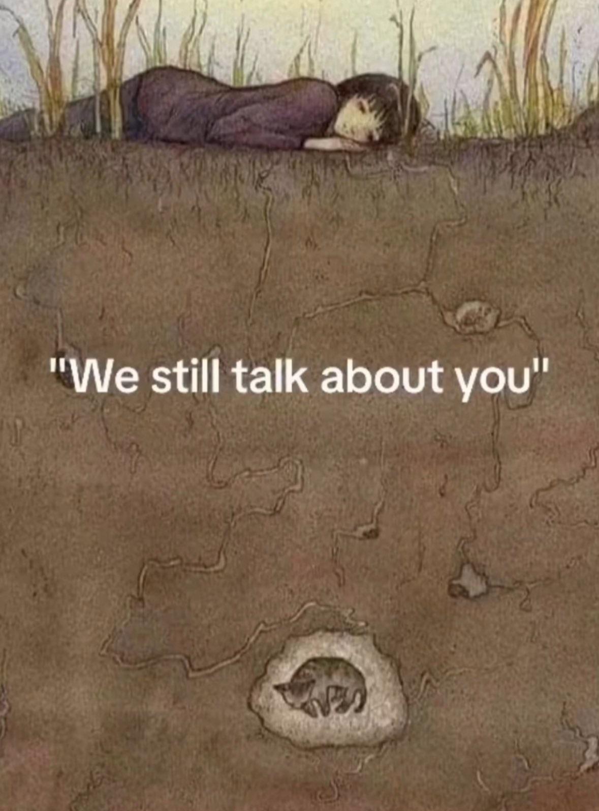 This SadMemes, RelatableMemes, ReactionMemes meme features Hand-drawn style image: person lying on grass above ground; underground cross-section shows a curled fox sleeping in a den. Overlaid text: "We still talk about you".. Created and shared on Jart.lol, this image meme represents the best of internet culture and humor.