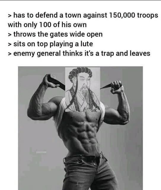 This FunnyMemes, HistoryMemes, ReactionMemes meme features > has to defend a town against 150,000 troops with only 100 of his own > throws the gates wide open > sits on top playing a lute > enemy general thinks it's a trap and leaves Grayscale image: a muscular male torso flexing in jeans; the head is a black-and-white drawing of an ancient strategist pasted over the photo.. Created and shared on Jart.lol, this image meme represents the best of internet culture and humor.