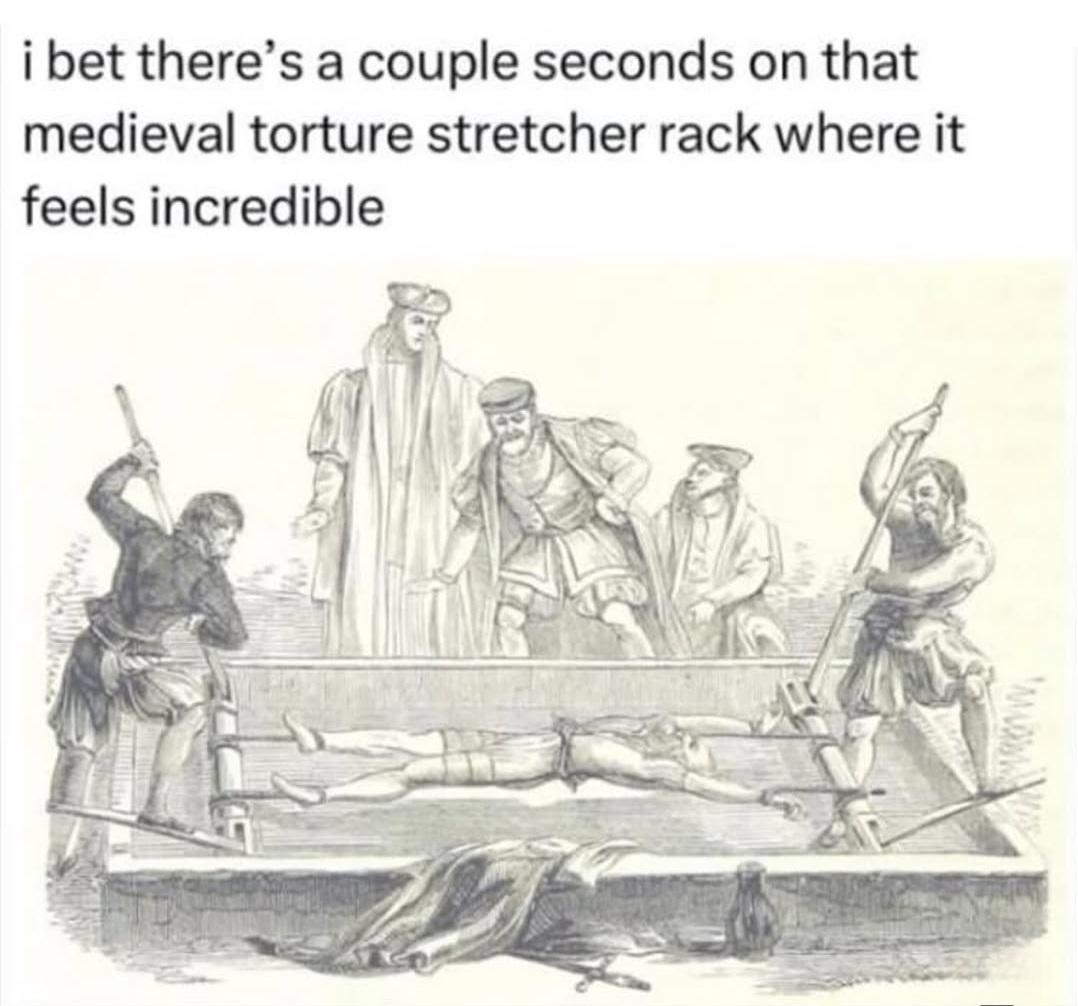 Stop right there — this medieval torture rack meme jokes about that brief moment when the stretch feels incredible. Viral dark humor meme using a historical engraving.