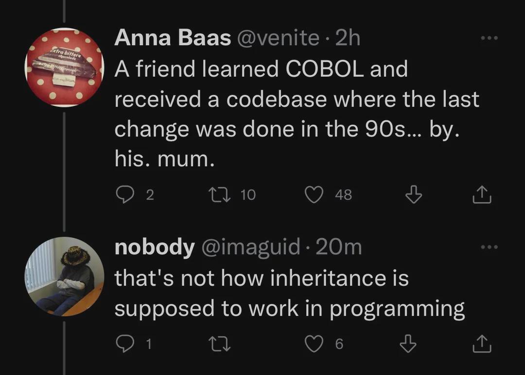 This FunnyMemes, ProgrammingMemes, TechMemes, TwitterMemes meme features Screenshot of two tweets. First tweet: A friend learned COBOL and received a codebase where the last change was done in the 90s by his mum. Second tweet replies: that's not how inheritance is supposed to work in programming.. Created and shared on Jart.lol, this image meme represents the best of internet culture and humor.