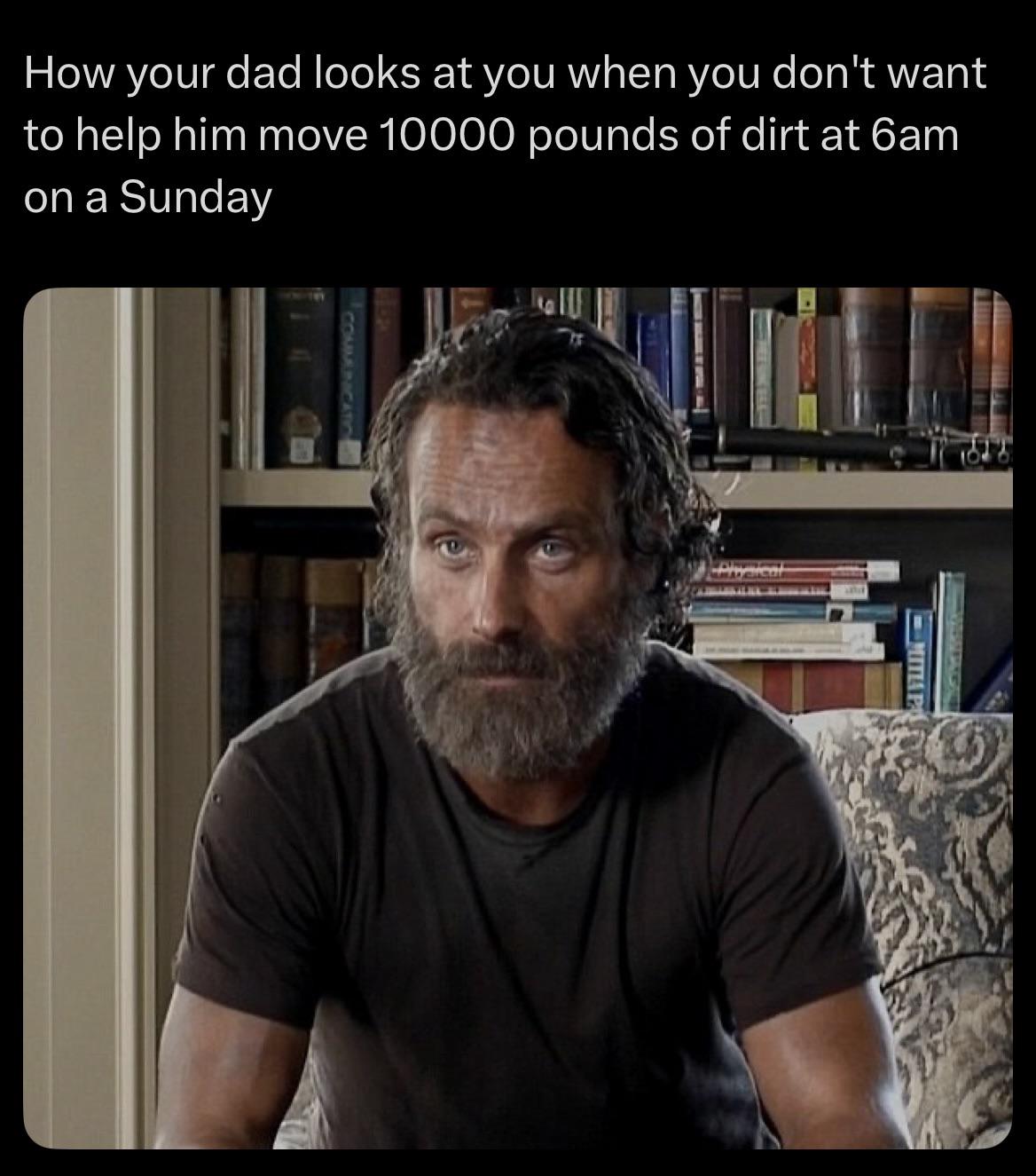 #funny #relatable #dad humor #rick grimes #the walking dead #disappointed #manual labor #sunday morning #reaction image #meme #parenting #family dynamics