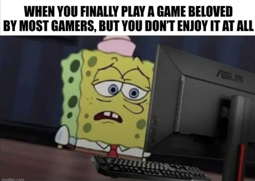 A relatable gaming meme showing a bored SpongeBob looking at his computer screen when a highly praised game fails to meet expectations or personal taste.