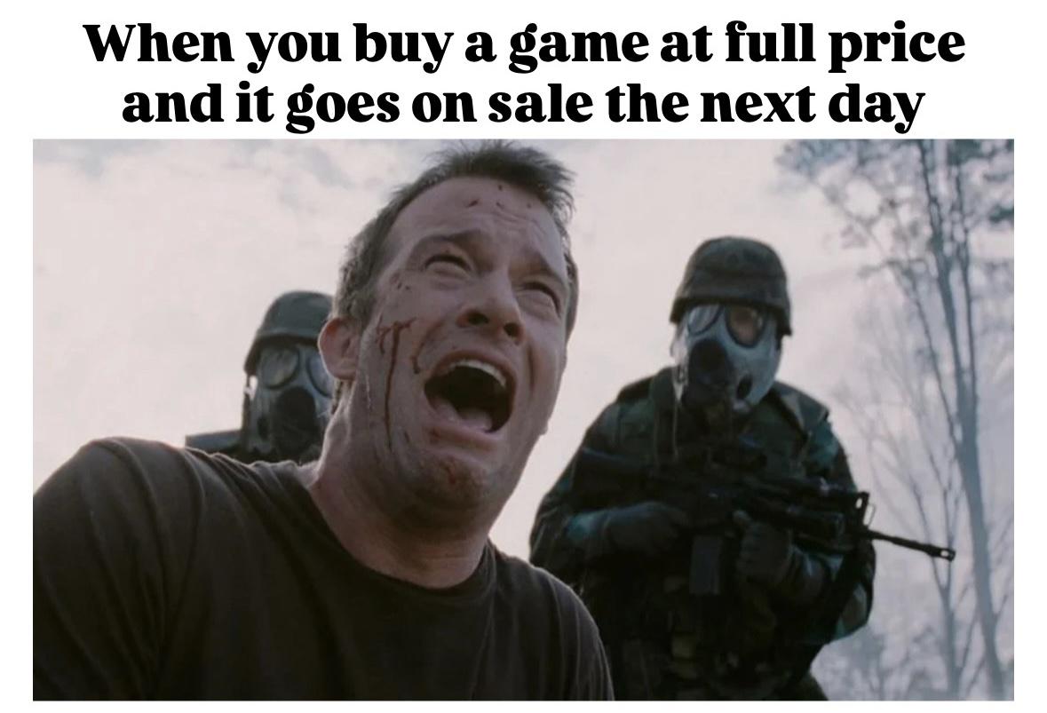 A man screams in anguish in this relatable gaming meme about purchasing a video game at full price only to see it go on sale the very next day.