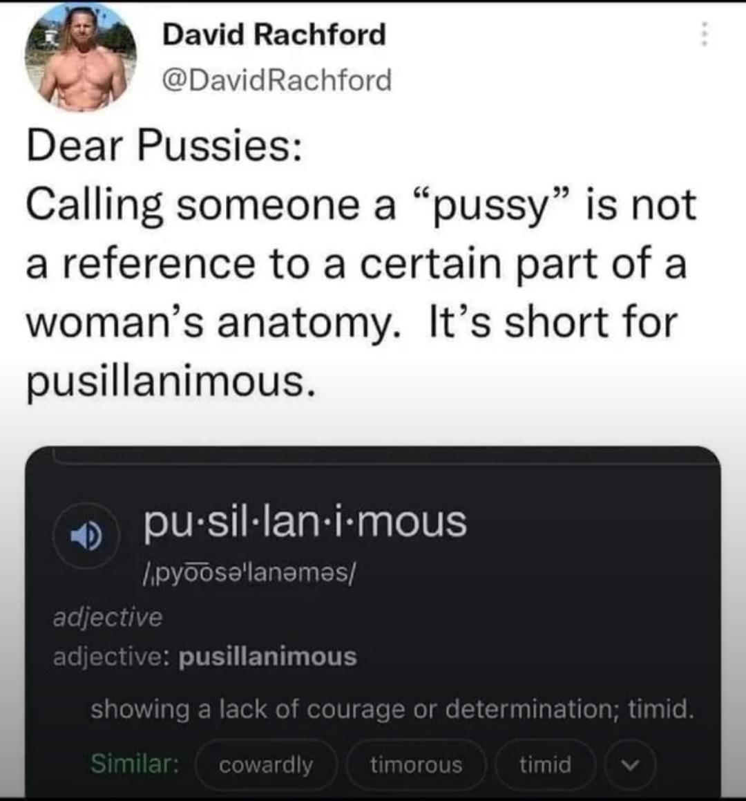 A viral Twitter post explaining the etymology of the word pussy as being short for pusillanimous with a dictionary screenshot, making for a popular text meme.