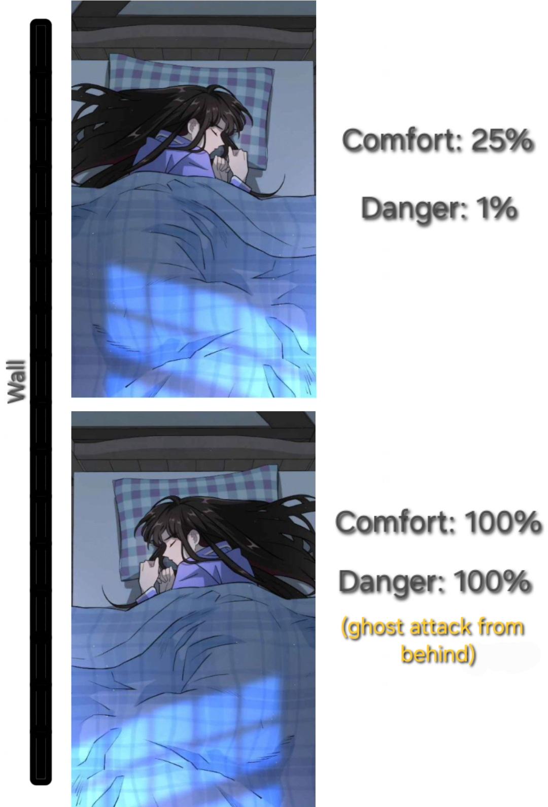This FunnyMemes, ReactionMemes, AnimeMemes meme features Two-panel anime style comic of a girl sleeping facing a wall on the left. Left margin shows a vertical label 'Wall'. Top panel text: 'Comfort: 25% Danger: 1%'. Bottom panel text: 'Comfort: 100% Danger: 100% (ghost attack from behind)'. Girl curled under blanket with blue night light pattern.. Created and shared on Jart.lol, this image meme represents the best of internet culture and humor.