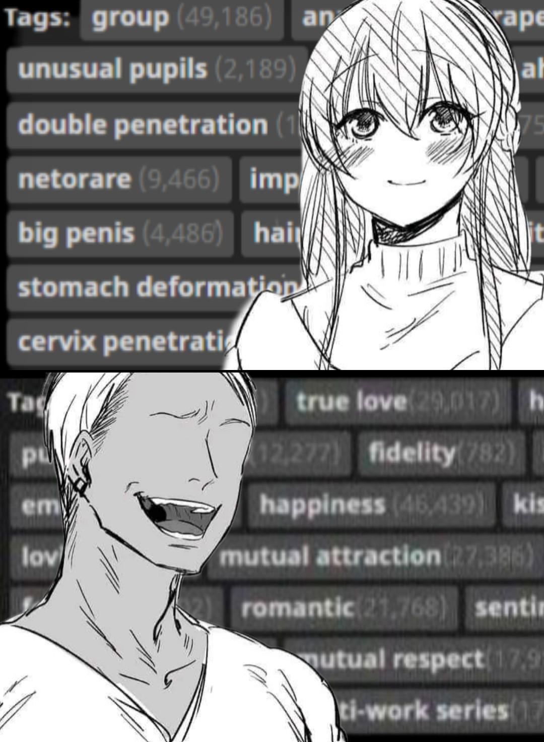 This FunnyMemes, ReactionMemes, AnimeMemes meme features Two-panel meme. Top panel: sketch of a blushing smiling anime girl over a blurred tag list showing words like 'unusual pupils', 'double penetration', 'netorare', 'big penis', 'stomach deformation', 'cervix penetration'. Bottom panel: sketch of a laughing man with closed eyes over a blurred tag list showing words like 'true love', 'fidelity', 'happiness', 'mutual attraction', 'romantic', 'mutual respect'.. Created and shared on Jart.lol, this image meme represents the best of internet culture and humor.