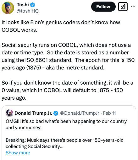 Tagged with funny, tech fail, confused, twitter screenshot, COBOL, programming humor, viral memes, social security, coding memes, software engineering, misunderstanding, legendary meme, this meme is easily discoverable through Jart's advanced search system. These tags help users find similar memes and explore related content across our platform.
