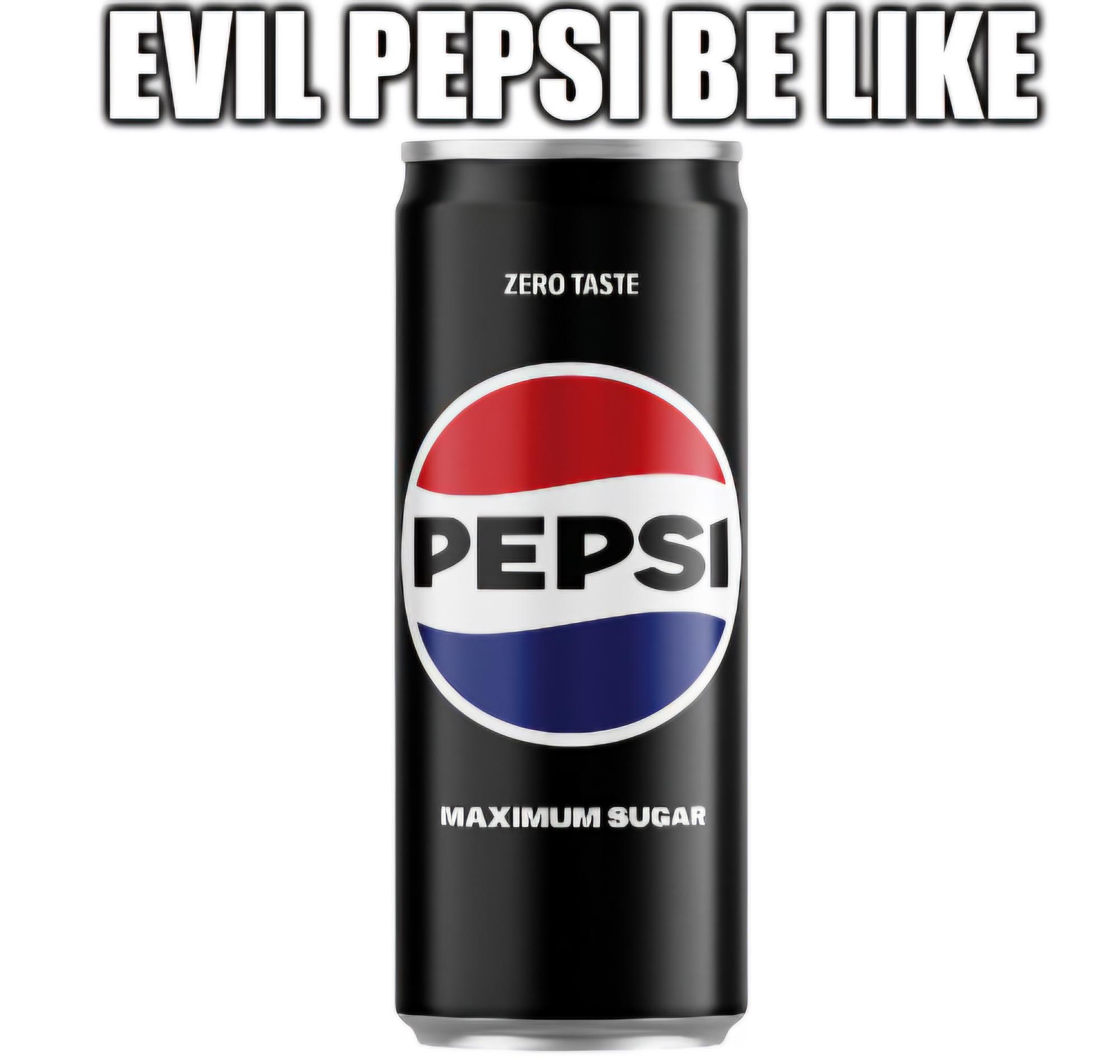 Evil Pepsi meme flips expectations by showing a can labeled 'zero taste, maximum sugar.' This viral meme template is perfect for soda fans and meme lovers.