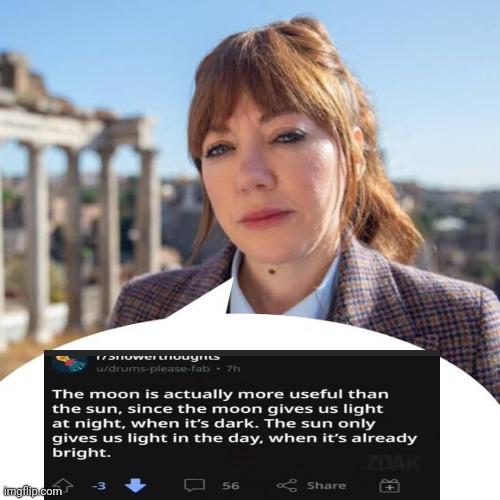 A Philomena Cunk meme featuring a Reddit shower thought that claims the moon is more useful than the sun because it provides light when it is actually dark.