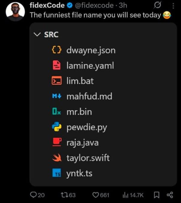 #funny #coding #programming #developer humor #tech meme #software engineering #pun #file extensions #relatable #twitter screenshot #humor #dev life
