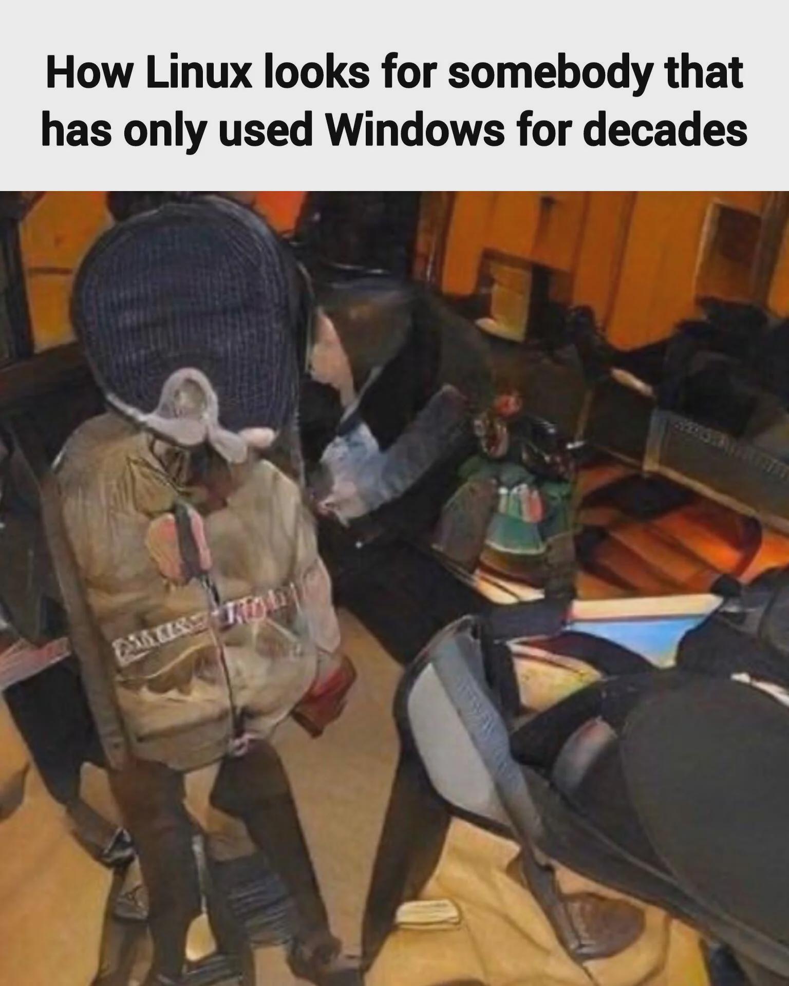 This humorous tech meme depicts the confusing perspective of the Linux operating system when encountering users who have exclusively used Windows for decades.