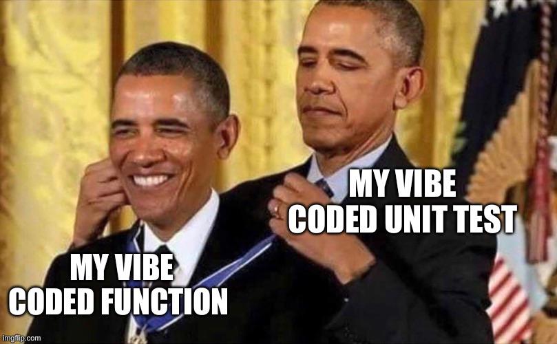 This ProgrammingMemes, WorkplaceMemes, FunnyMemes meme features Person awarding medal to themselves with text 'MY VIBE CODED FUNCTION' and 'MY VIBE CODED UNIT TEST'.. Created and shared on Jart.lol, this image meme represents the best of internet culture and humor.