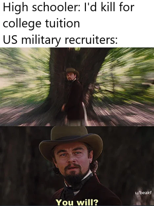 #funny #dark humor #military recruiter #college tuition #leonardo dicaprio #django unchained #relatable #meme #satire #image macro #student loan #recruitment