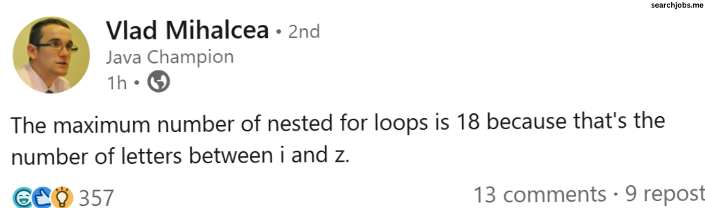 This FunnyMemes, ProgrammingMemes, WorkMemes meme features A LinkedIn-style post with a profile photo. Text says: The maximum number of nested for loops is 18 because that's the number of letters between i and z.. Created and shared on Jart.lol, this image meme represents the best of internet culture and humor.