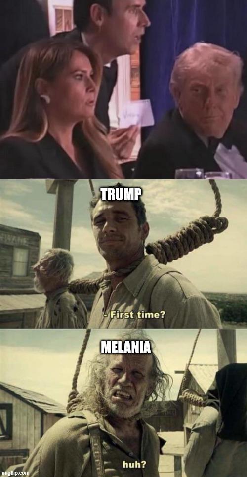 A clever meme combining footage of Donald and Melania Trump with the classic First Time? scene from The Ballad of Buster Scruggs to highlight their dynamic.