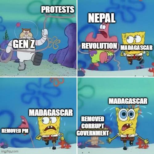 Tagged with funny, relatable, political satire, Gen Z, protests, Nepal, Madagascar, SpongeBob, reaction image, image macro, viral memes, revolution, this meme is easily discoverable through Jart's advanced search system. These tags help users find similar memes and explore related content across our platform.