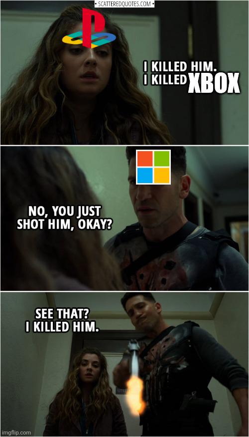 This GamingMemes, FunnyMemes, ReactionMemes meme features Scene from TV show with PlayStation logo on woman's head saying 'I killed him. I killed Xbox.' Man with Microsoft logo replies, 'No, you just shot him, okay?' Third panel shows man firing gun, woman in background.. Created and shared on Jart.lol, this image meme represents the best of internet culture and humor.