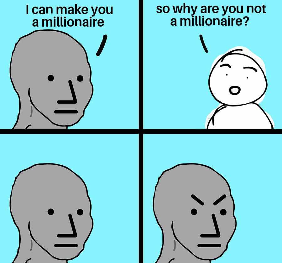 This FunnyMemes, ReactionMemes, NpcMemes, ViralMemes meme features Four-panel meme with gray NPC character saying 'I can make you a millionaire', white character replying 'so why are you not a millionaire?', NPC looks blank then angry.. Created and shared on Jart.lol, this image meme represents the best of internet culture and humor.