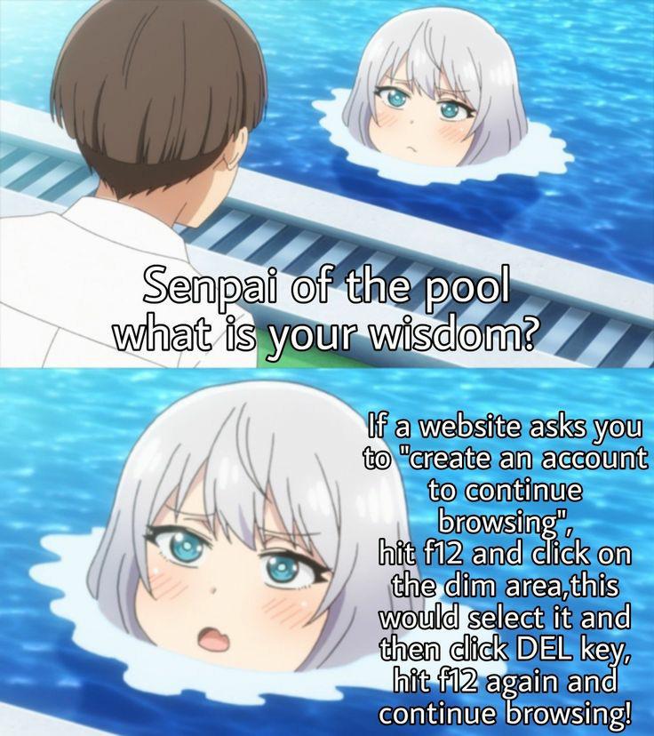 Tagged with funny, relatable, anime girl, pool scene, reaction image, image macro, tech humor, browsing tip, bypass signup, viral memes, hacking meme, tutorial meme, this meme is easily discoverable through Jart's advanced search system. These tags help users find similar memes and explore related content across our platform.